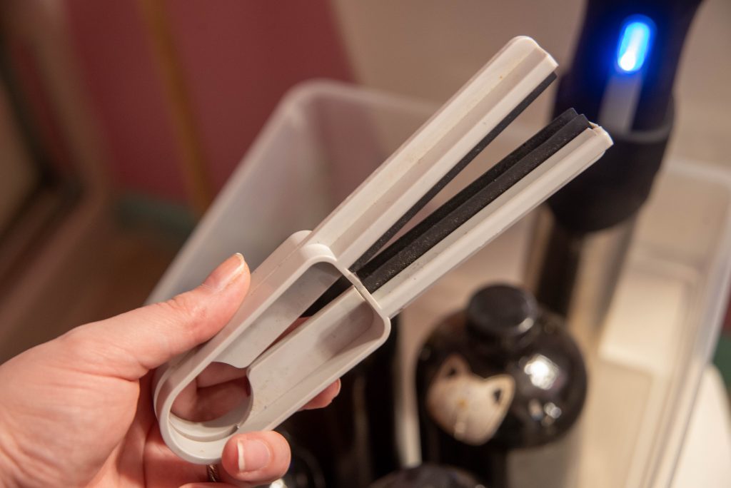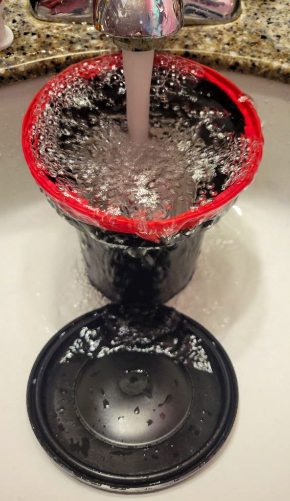 This part goes against everything I was ever shouted about as a child, but you’re going to run the tap for three whole minutes now. You can remove that inner lid now, too. I turn the tap on, check the temperature (make sure it’s between 95-105 Fahrenheit), rinse the inner lid, and then place the tank directly beneath the stream. That three minutes, I spend wiping up spills.