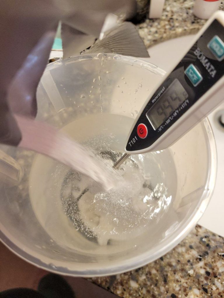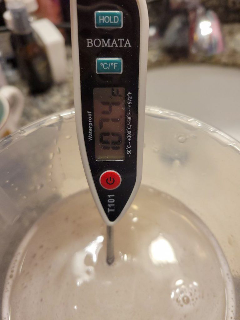 It will heat the water up about 10 degrees Fahrenheit when you add the mix. You’re supposed to start with water at about 100 degrees, and develop with Developer which is at 102 degrees. So, after mixing it, you will need to let it cool a bit. I set the jug on the cold tile floor while I mix up the rest of the chemicals and get the tub ready.