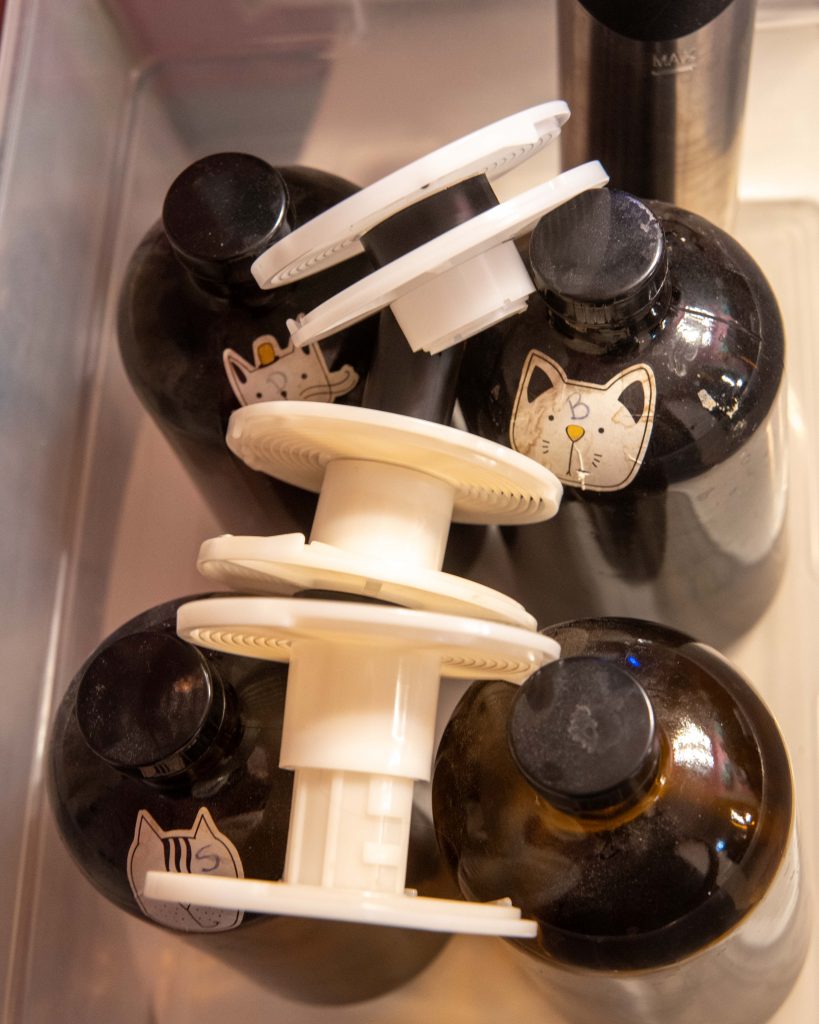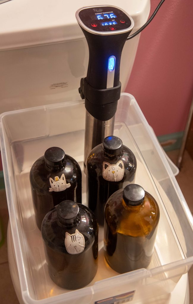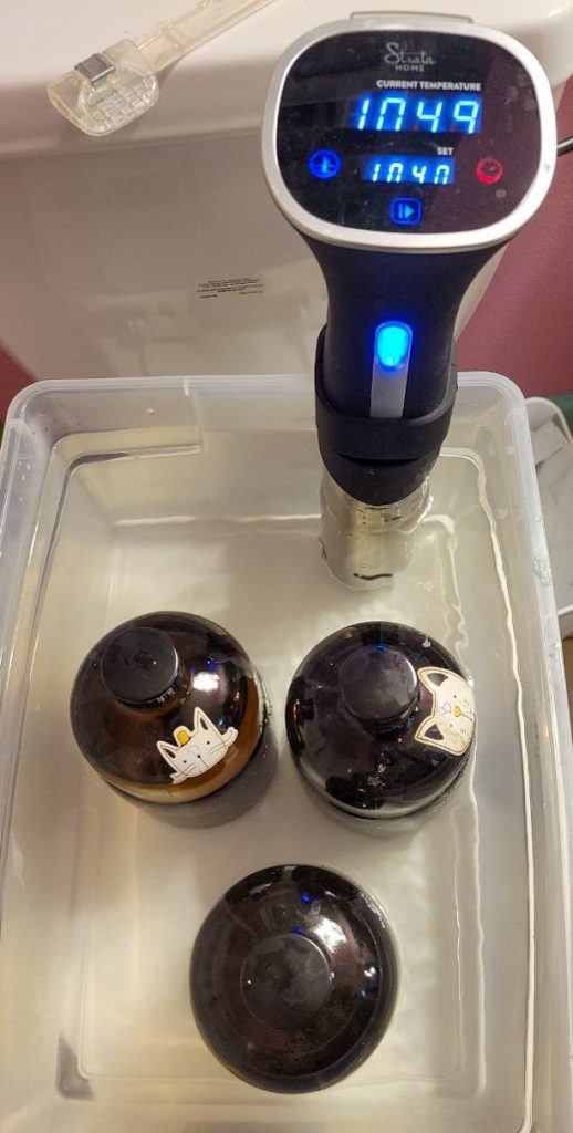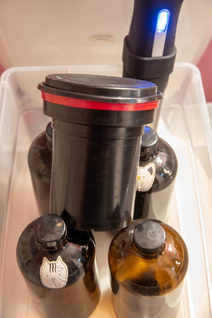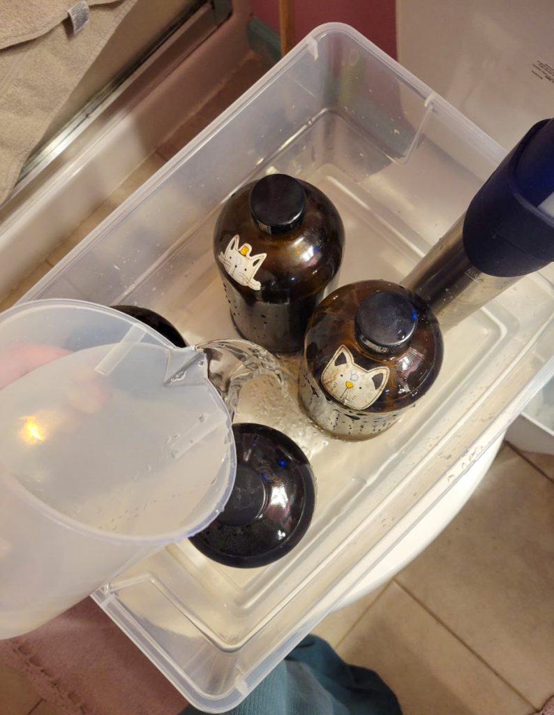 Now, you place the full bottles in the container and set up the sous-vide, and you start filling that tub with water that’s about 105 degrees. Get the water as high as is feasible without sloshing or risking overflow. The higher the container, the better. I’d like mine to be taller.