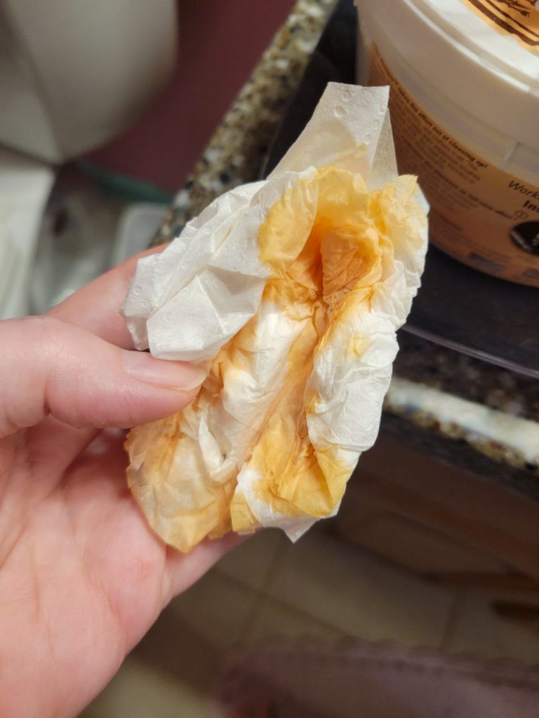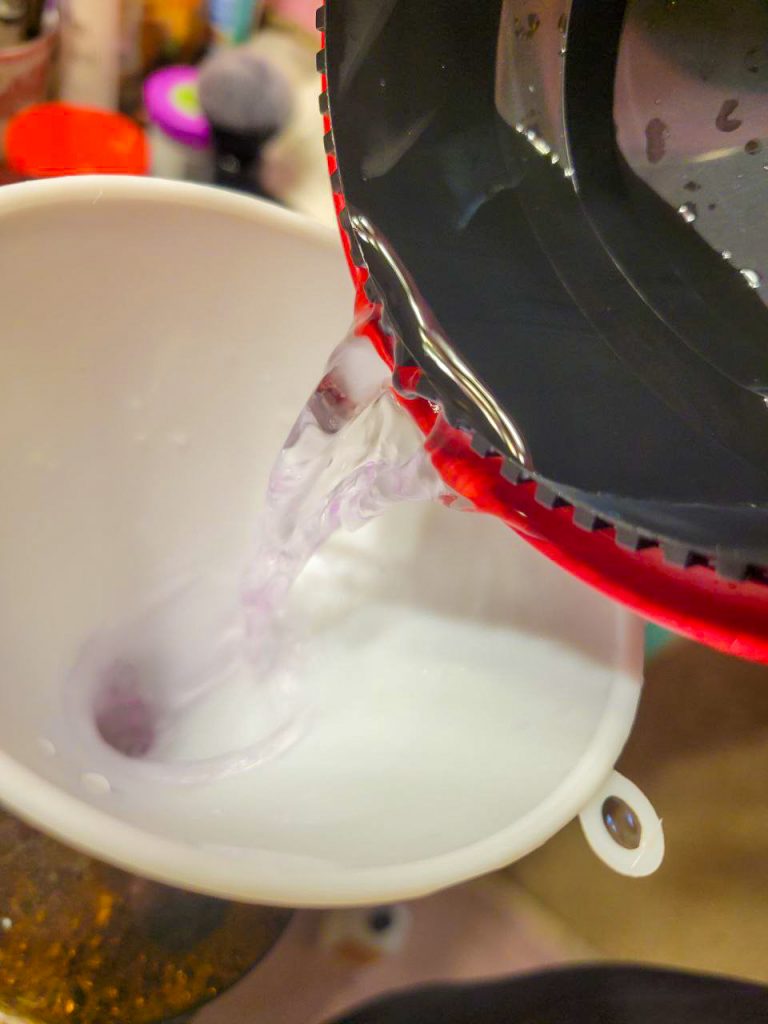 You’ve conquered the Developer stage and the good news is that the Blix stage is identical in terms of timing and agitation/inversions. The only thing that’s different, is that you will definitely have to release the buildup of heat and chemical reaction from the tank after your inversions (you can do this with the Developer too, to get yourself in a groove). If you don’t push the air out, Blix (which is BLeach and fIX) will get all over everything. It will leak everywhere, it will make your hands both slimy and dry at the same time (wear gloves), and it will turn all your fabrics white. Do this step with a paper towel, because this is what will spray out of the tank: