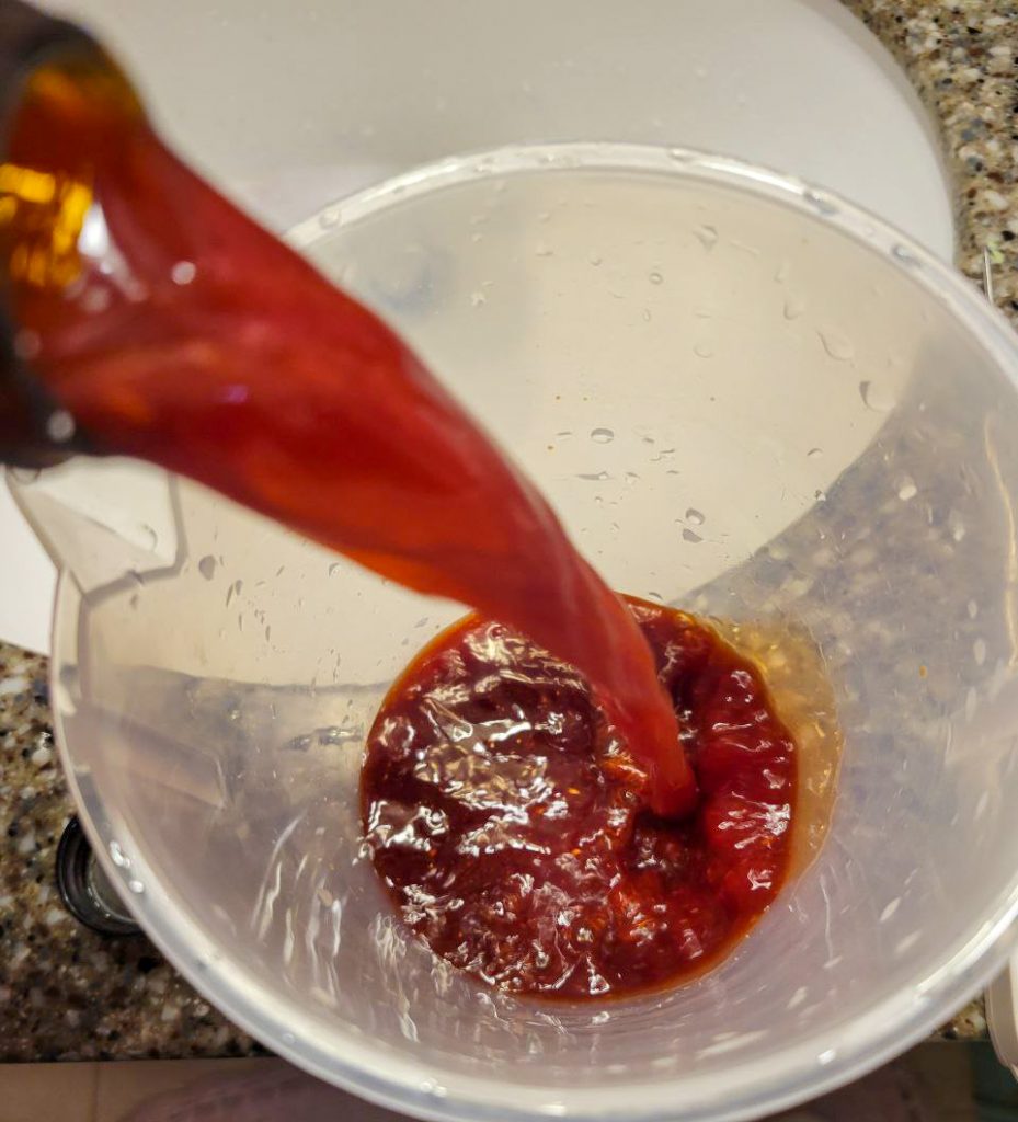 If you’re doing this step, now’s the time. I put the inner lid back in for this because it makes it easier to pour back out. But you just pour room temperature stabiliser in the tank, give it a ten second agitation, and then let it sit for fifty seconds. One minute total. Then, funnel that back in the jug.