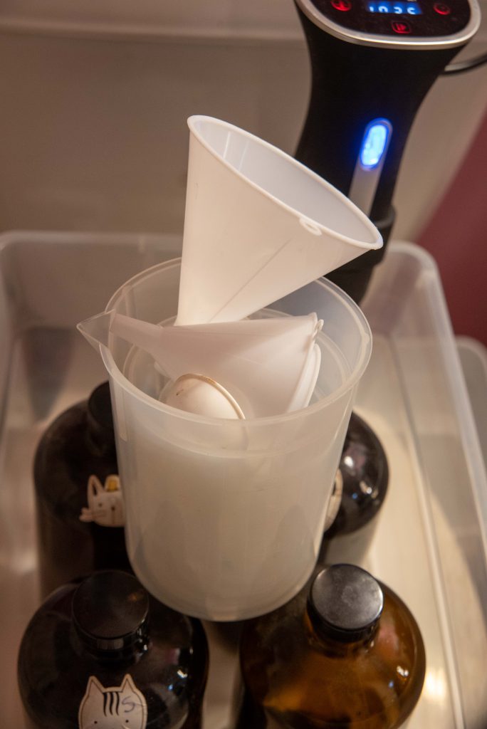 • Carefully funnel the Developer back into the jug (rinse the funnel too), and put the jug into the container with the sous-vide.