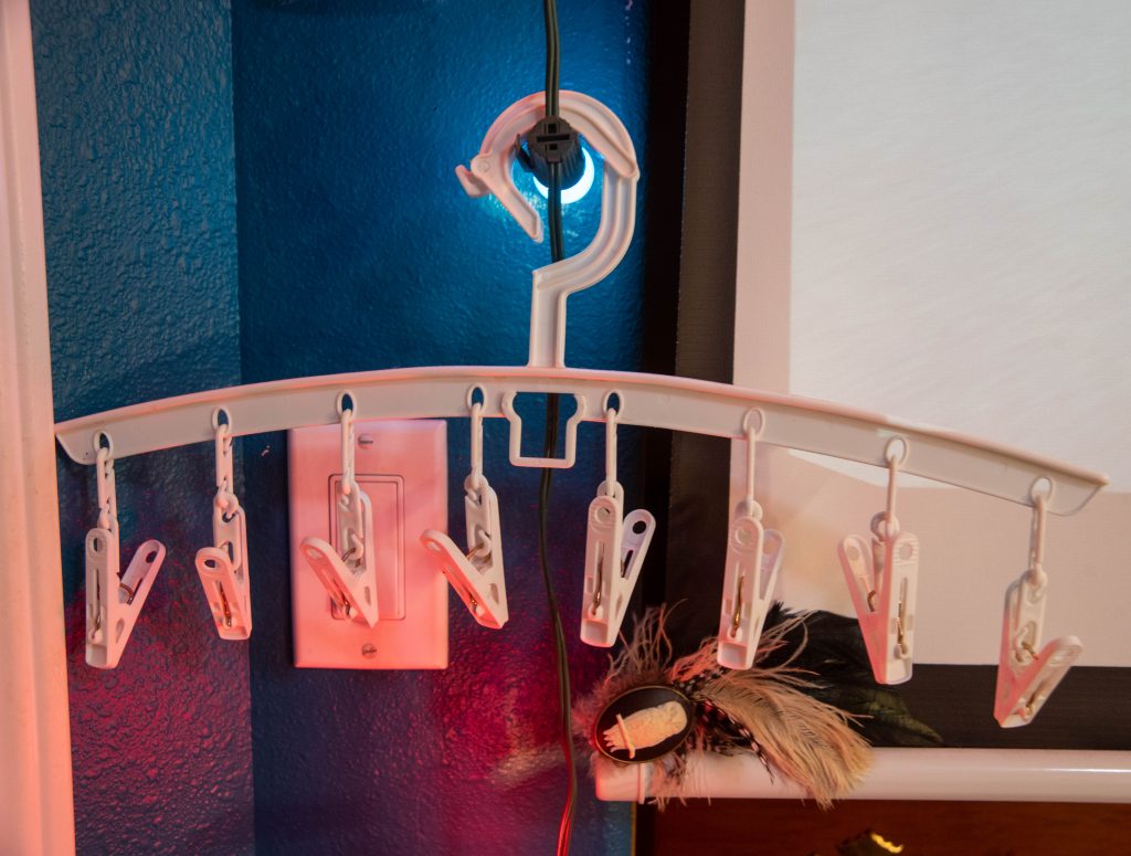 I use plastic hangers with little clips on them. The film must hang straight down and not touch anything else (especially not the other strips of film, that will ruin all the hard work you’ve done in an instant).