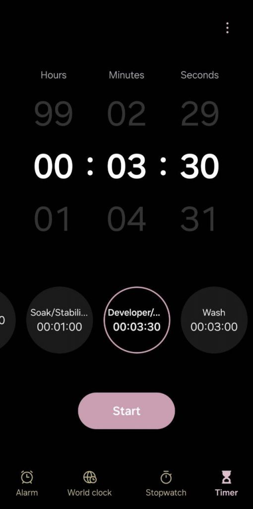 • Agitate the developer with the little stick that came with the tank until the timer reads 03:20.