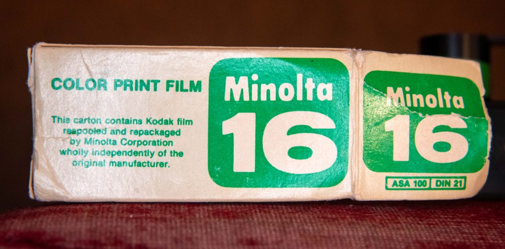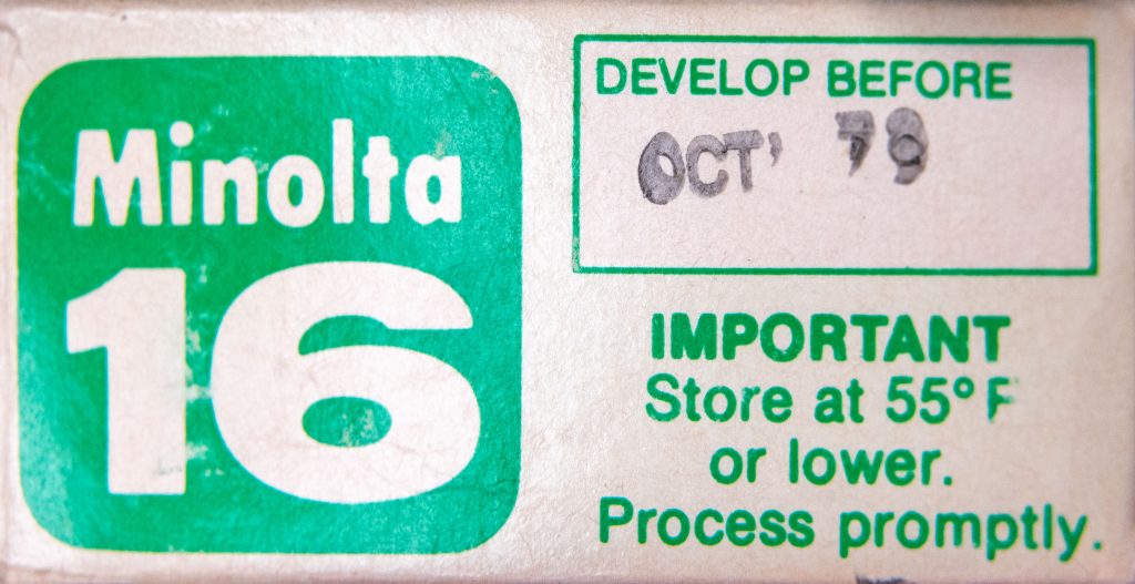 While going through some boxes in his garage, my father found an exposed-but-yet-undeveloped roll of 16mm film from around 1979. This roll was Minolta branded (Kodak rebranded), in its little dark box still, and had been shot with his Minolta 16 camera. He posted the roll to me with a note asking if I could develop it.