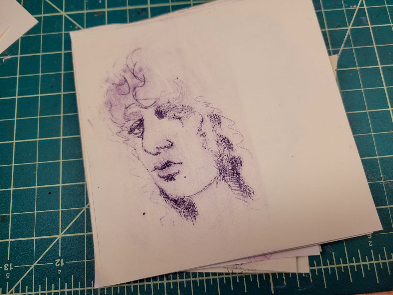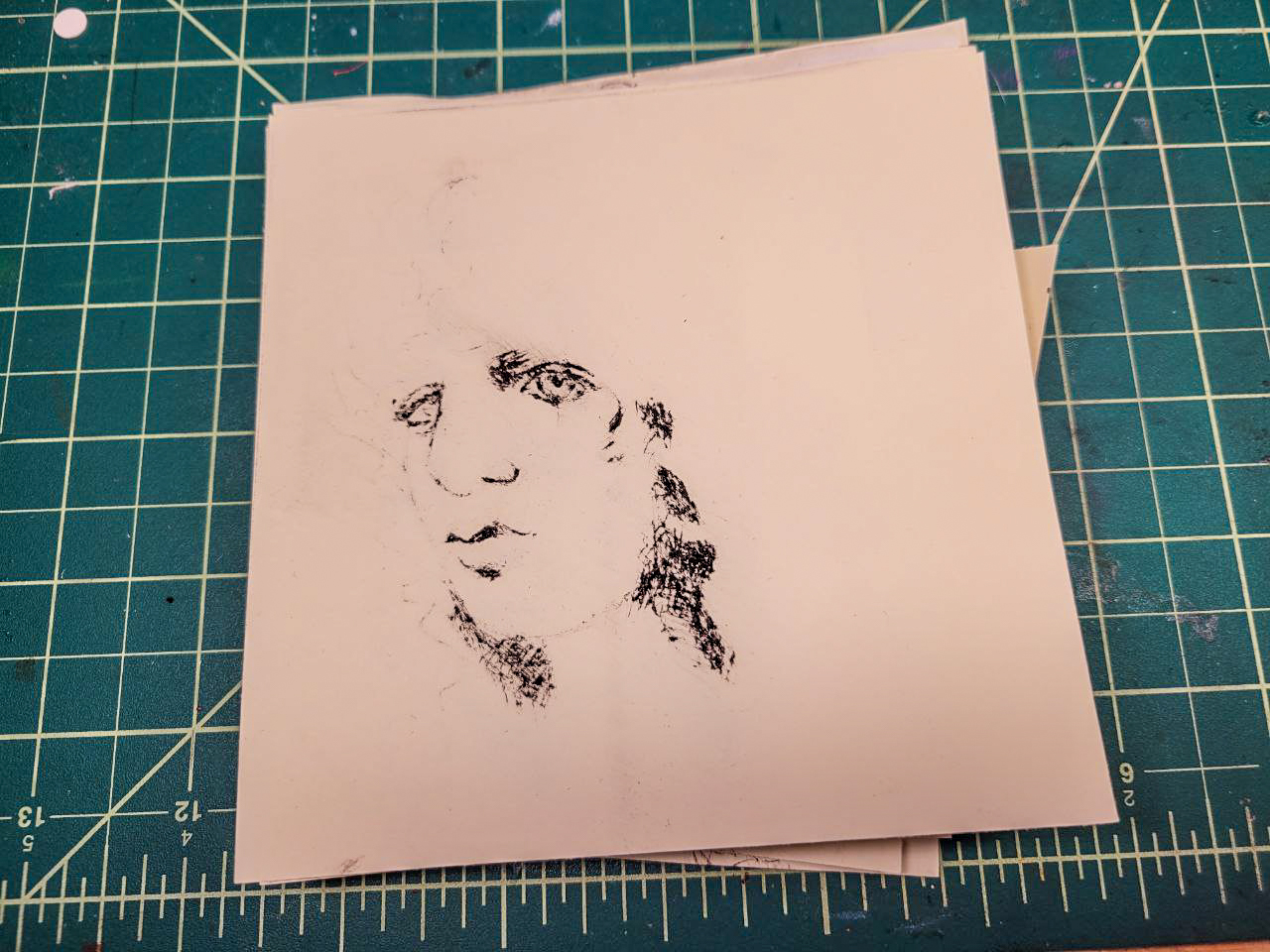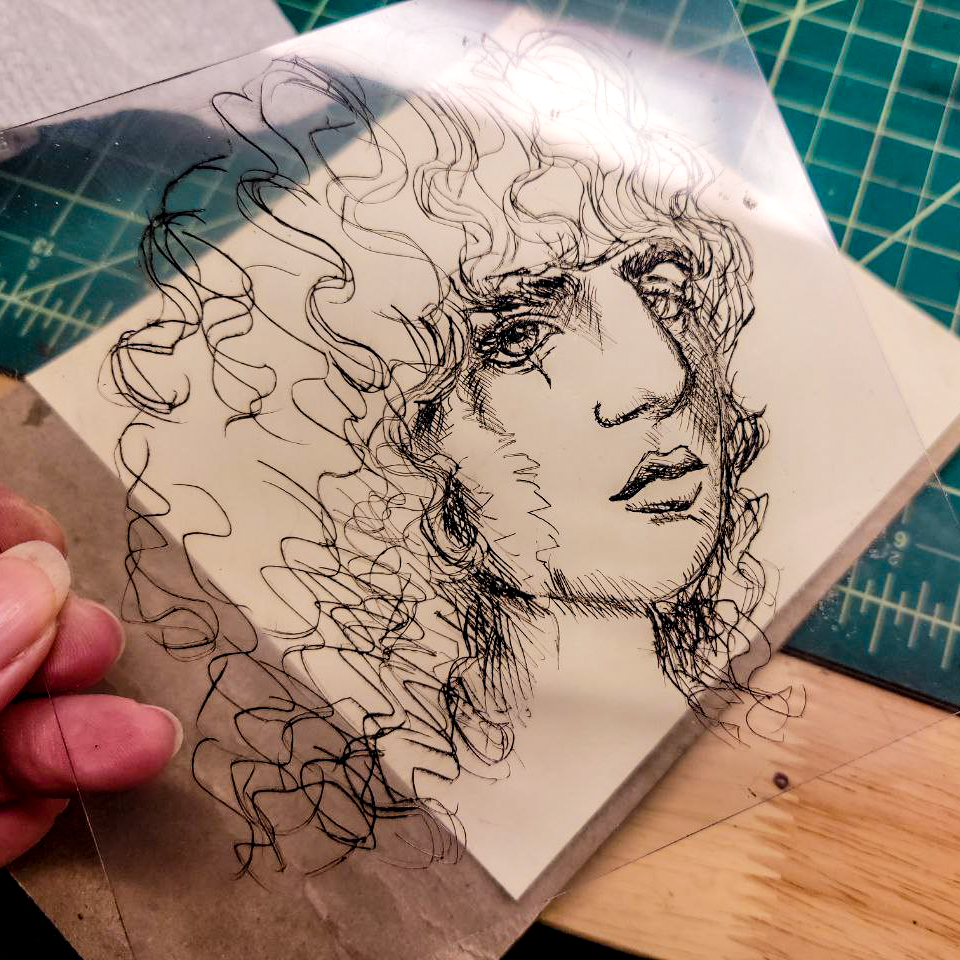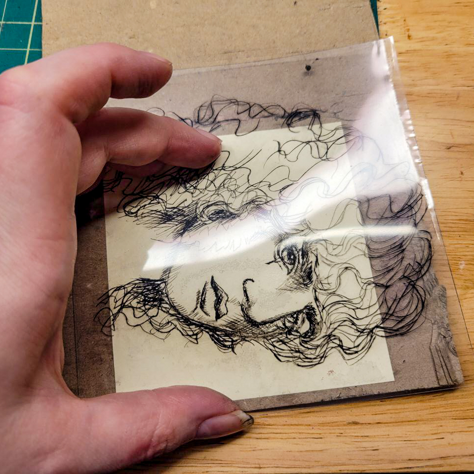 This is actually my second attempt, if I’m going to be perfectly honest, because the first time I did this, I thought I was inventing a new technique where I push hard on the plastic and the other side of it becomes the printed side. It kind of worked, but then I remembered etching has already been invented, but it must be done in reverse. So I had to start over and draw Mort backwards.