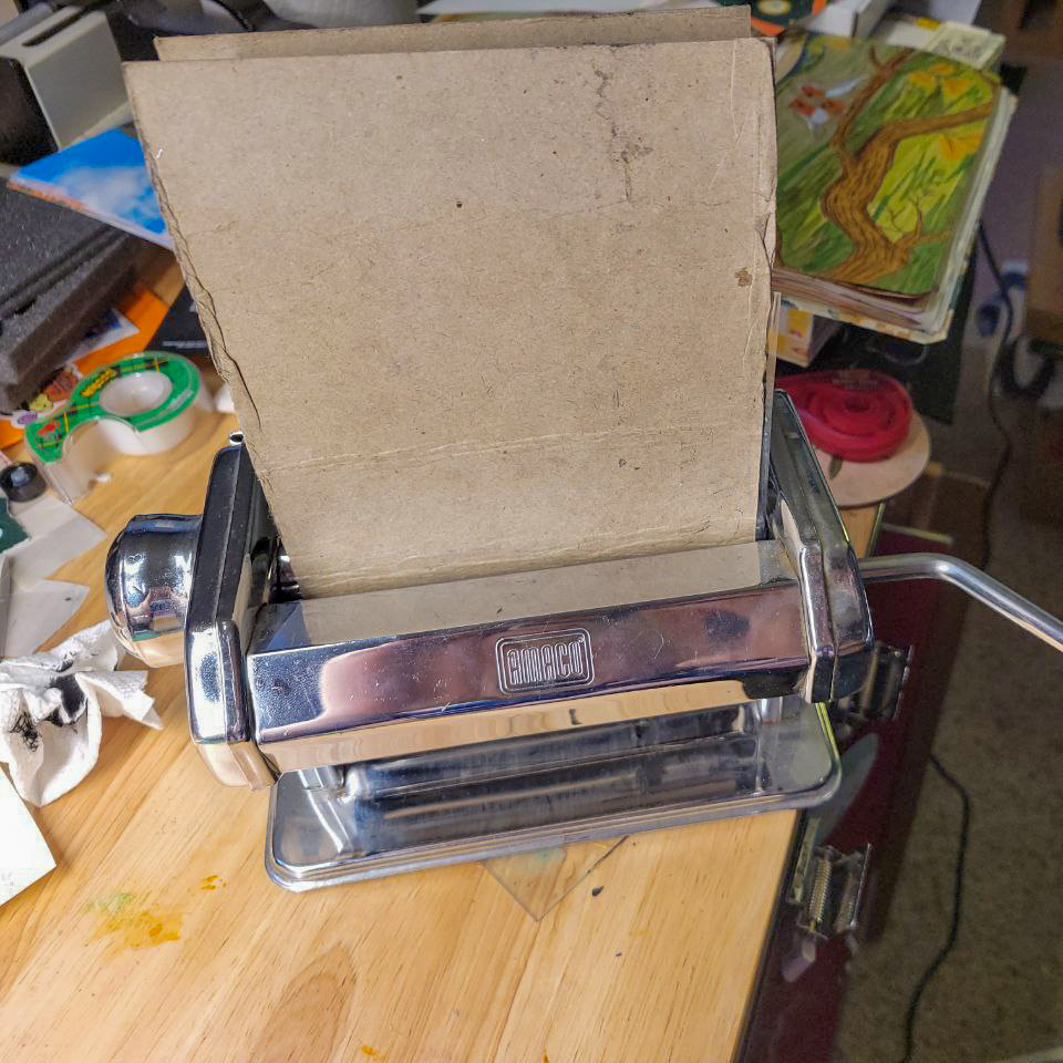 This is a clay roller from decades ago when I thought polymer clay was fun. I swear, I’ve used this thing for everything but clay. It comes in handy. I used bookboard as something stable to press against and, as is visible in the image, the bookboard did not faire well throughout the experiment. It fell apart, crumbled, an eventually split. These were terrible tools for this, and I do not recommend trying it. The clearance beneath the clay roller is only like three inches, and so you either bend the whole thing to get it out or reverse it back up, only pressing three inches. I made it work, but a spoon would have been better.