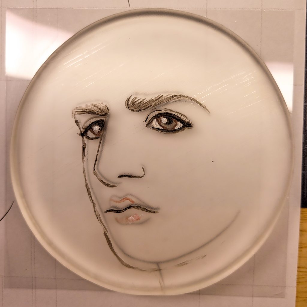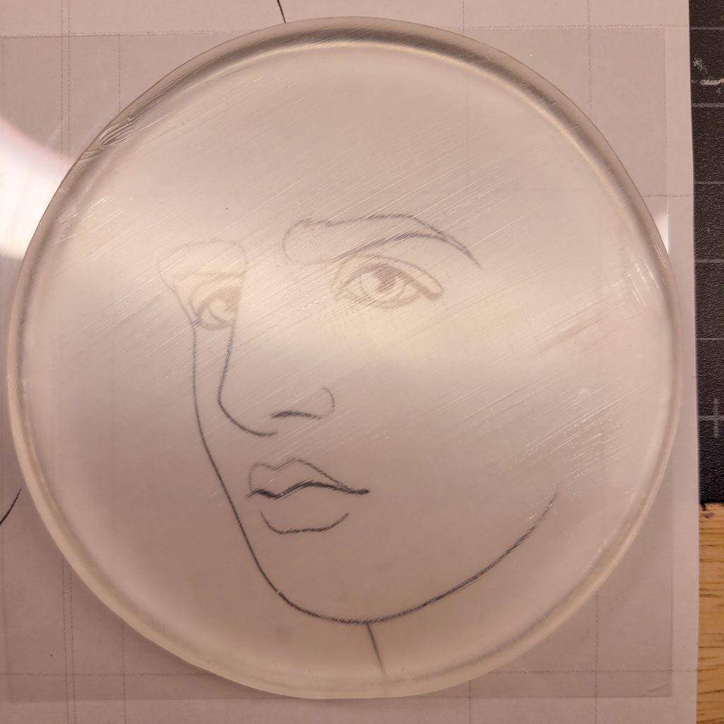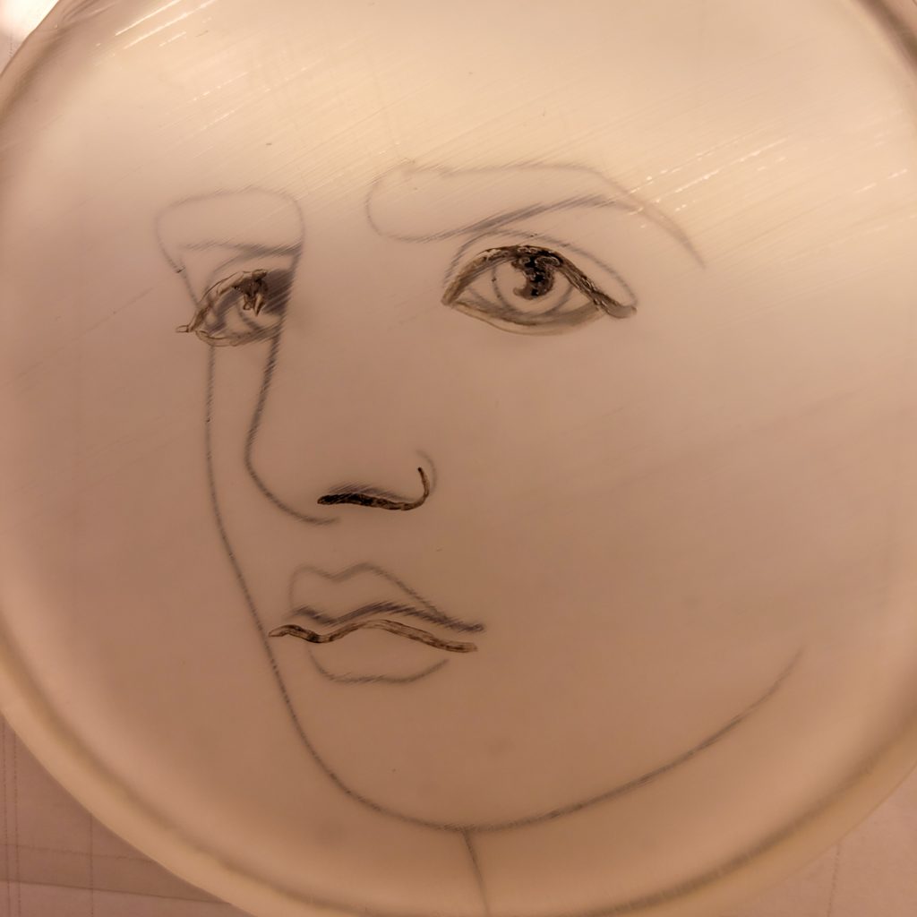 As usual, I used my default sketch of Mort in order to test out the medium. Since the plates are clear, it’s easy enough to have a printed version of the sketch beneath the plate and try and orient the size that way. I don’t recommend using that method for anything you want to copy intricately, though, because lining things up is an effort in hovering, closing one eye, and guessing. I probably should have just gone without it, but I was afraid of my composition being wonky by the time I got to the circular plate.
