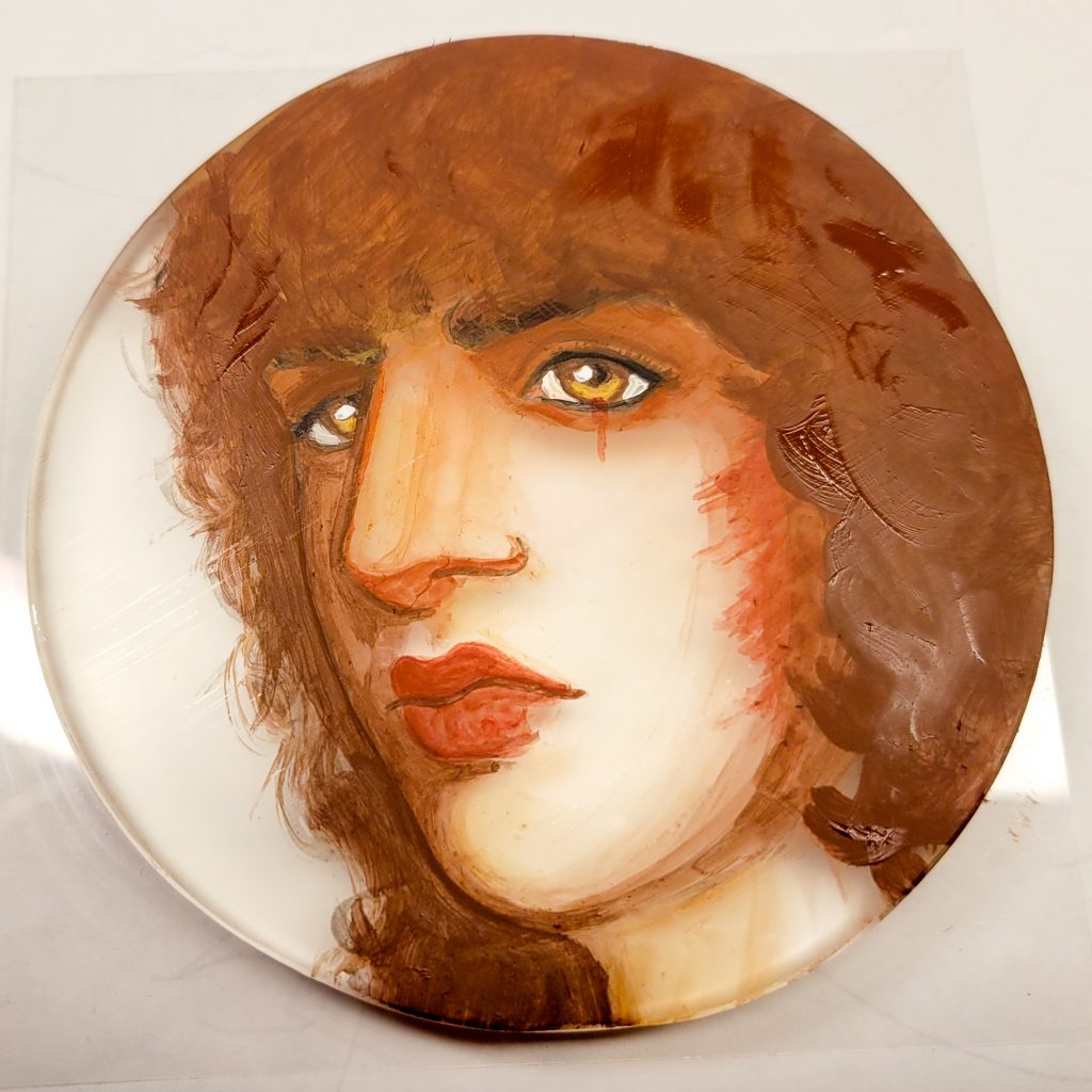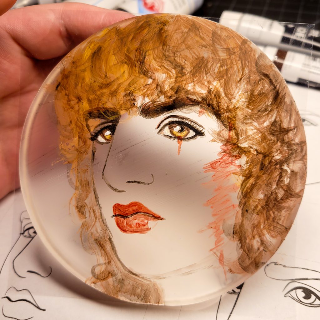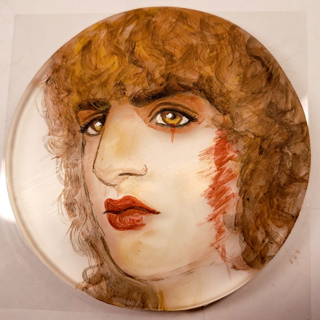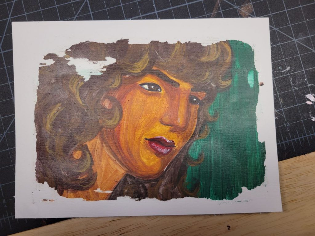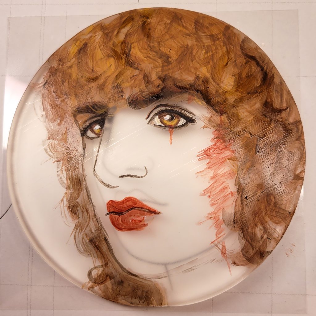 This one looks awful, but it has all the proper ideas! Before I added any paint at all, I put two layers of Golden Fluid Matte Medium over the entire plate. That made it so that the layers of paint would adhere cohesively and not crack. I did not wait for this one to dry fully, that’s the reason it’s missing pieces. I waited like thirty seconds when I needed to wait thirty minutes. Also, I painted everything in the wrong order. Starting with anything white, which makes the whites of the eyes pop out from the eye sockets.