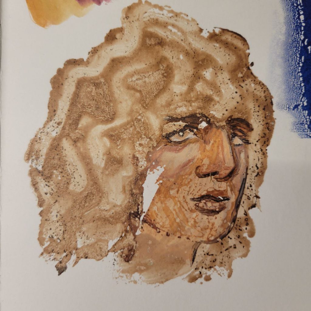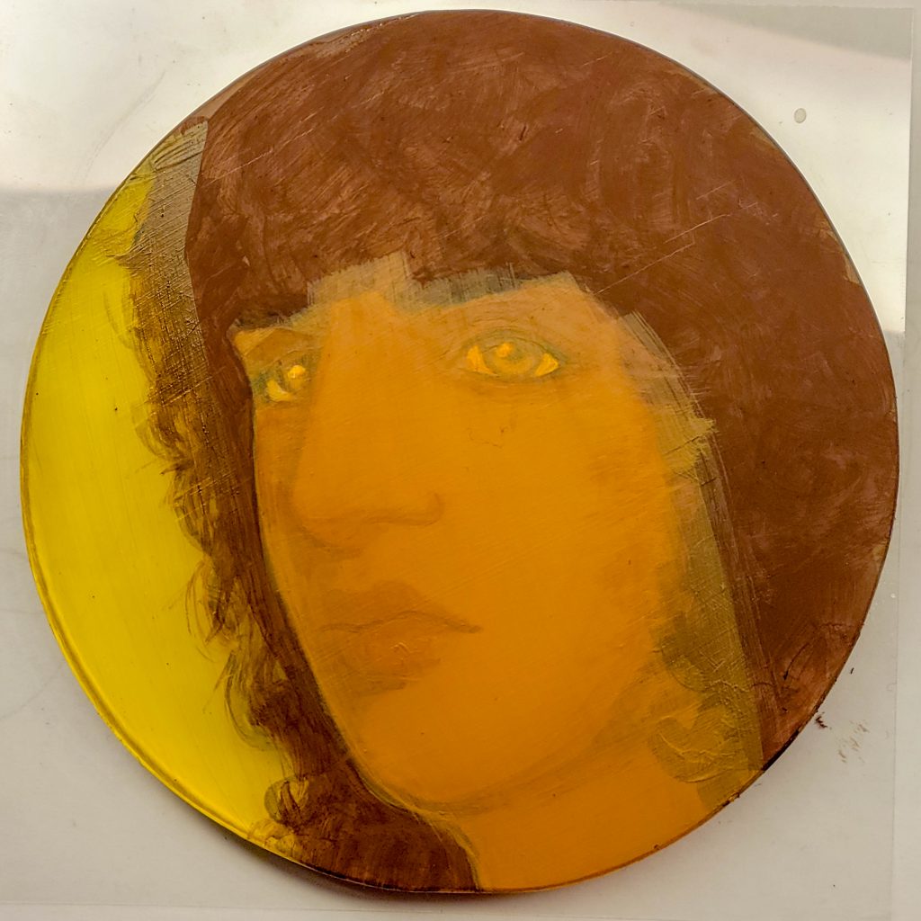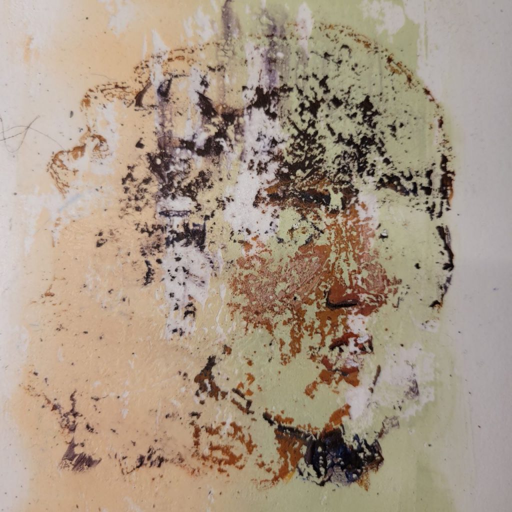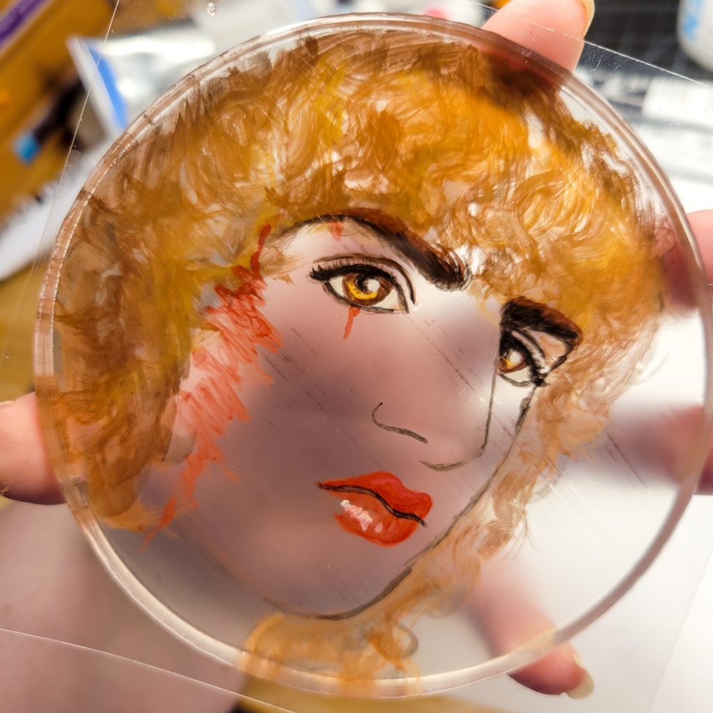 This one looks awful, but it has all the proper ideas! Before I added any paint at all, I put two layers of Golden Fluid Matte Medium over the entire plate. That made it so that the layers of paint would adhere cohesively and not crack. I did not wait for this one to dry fully, that’s the reason it’s missing pieces. I waited like thirty seconds when I needed to wait thirty minutes. Also, I painted everything in the wrong order. Starting with anything white, which makes the whites of the eyes pop out from the eye sockets.