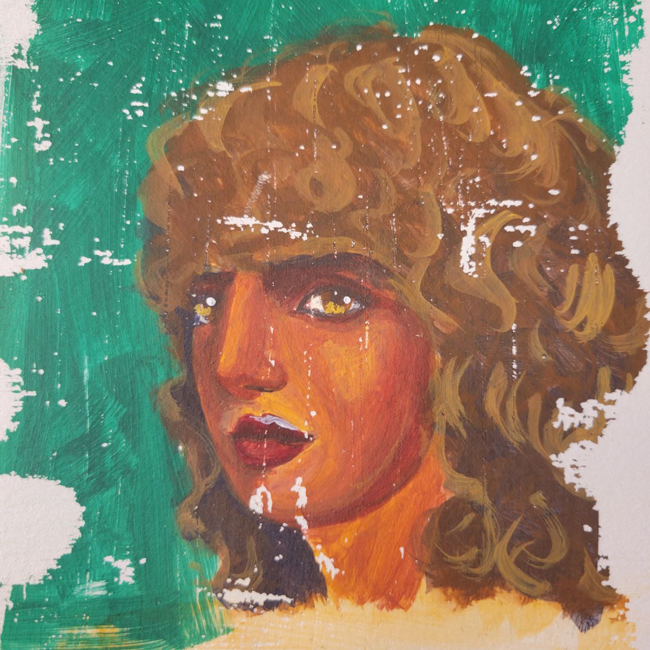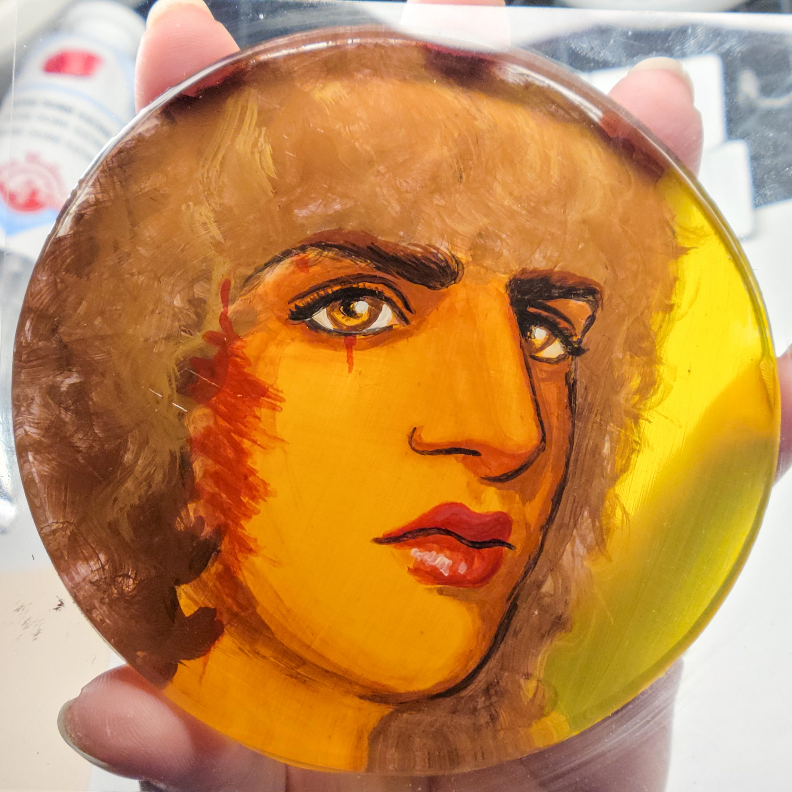 This one looks awful, but it has all the proper ideas! Before I added any paint at all, I put two layers of Golden Fluid Matte Medium over the entire plate. That made it so that the layers of paint would adhere cohesively and not crack. I did not wait for this one to dry fully, that’s the reason it’s missing pieces. I waited like thirty seconds when I needed to wait thirty minutes. Also, I painted everything in the wrong order. Starting with anything white, which makes the whites of the eyes pop out from the eye sockets.
