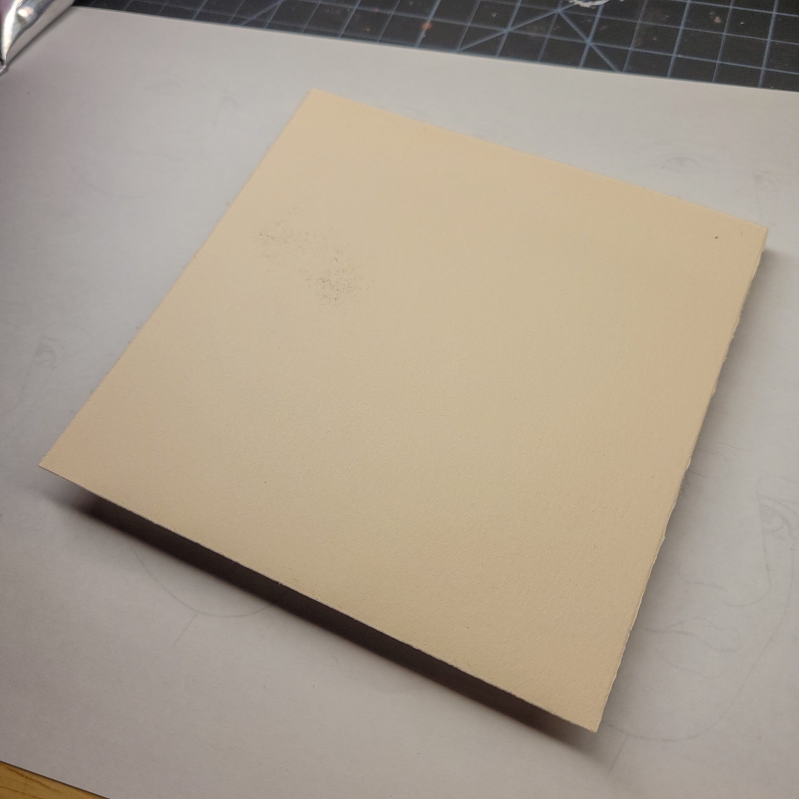 Then, I cut a bit of Fabriano Rosapina which was bigger than the circle (I think the circle is 4×4, so I cut a 5×5 sheet). I knew I’d need to trim it once it was done, because I didn’t have any nice way to line everything up.