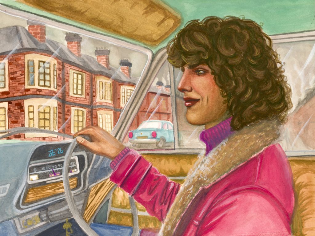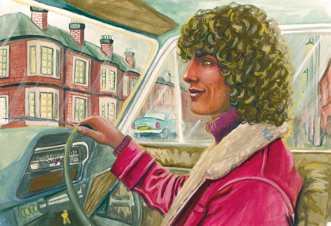 Russet Green is dabbed into everything in this painting, and I mean *dabbed,* which was a difficult balance for me to maintain. The car interior (seat/panelling/wood accents) are Russet Green with Iron Oxide Red and White. It’s also what the base mix for the skin was, but I added in some others for shadows highlights and blush. I used straight PG7 under the jaw for a spell, which caused me to panic a bit, but it looks alright. I do think that the face is unbalanced in tone, but it’s so so so much better than the other attempt.