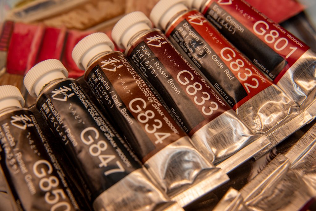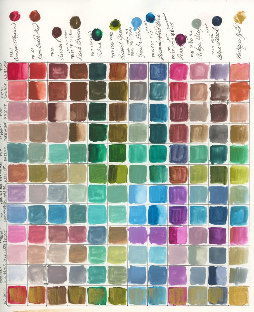 6 three-pigment mixes (three of which are shades/tints of two-pigment mixes): Dark Brown PY119+PR101+PBk11, Russet Green PY17+PG8+PR83, Geisha Blue PB15+PG7+PW6, Hummingbird Blue PB15+PG7+PY3, Peony PR122+PV23+PBr25, Rikyu Grey PG8+PR170+PW6
