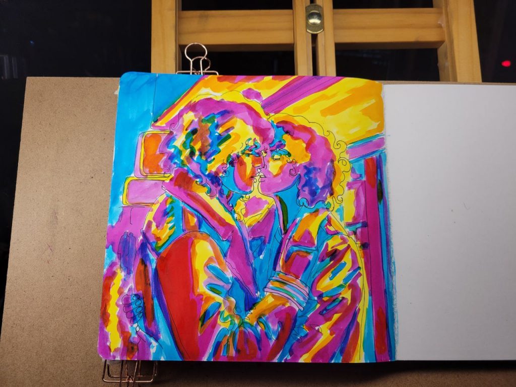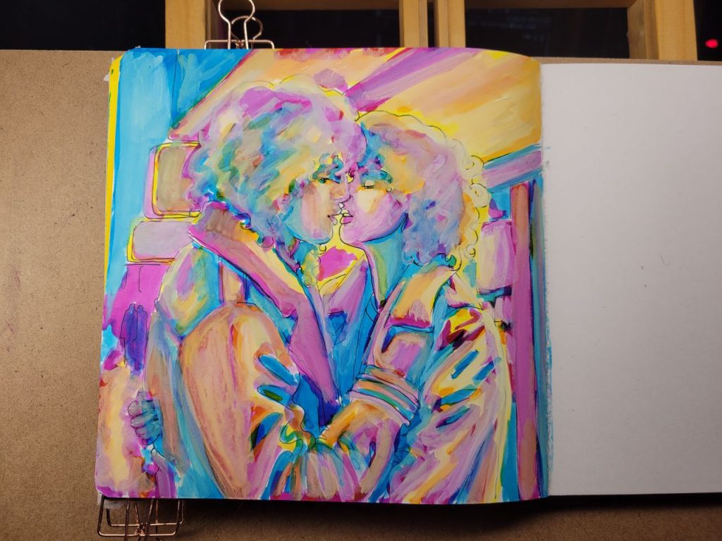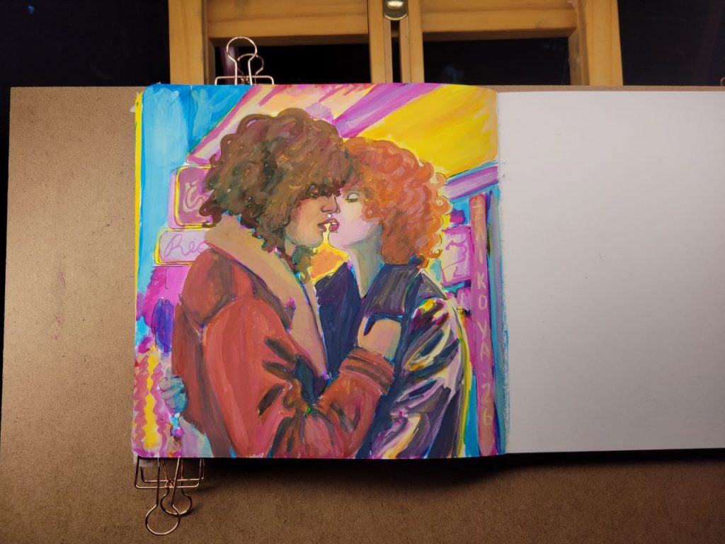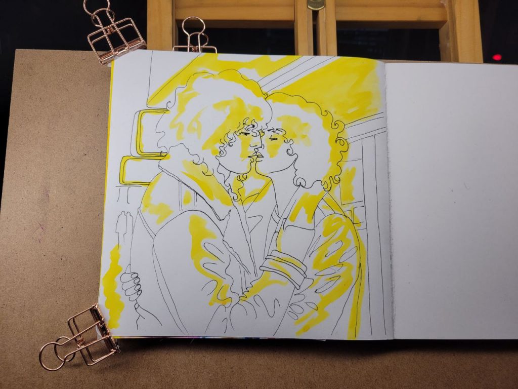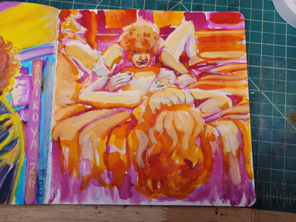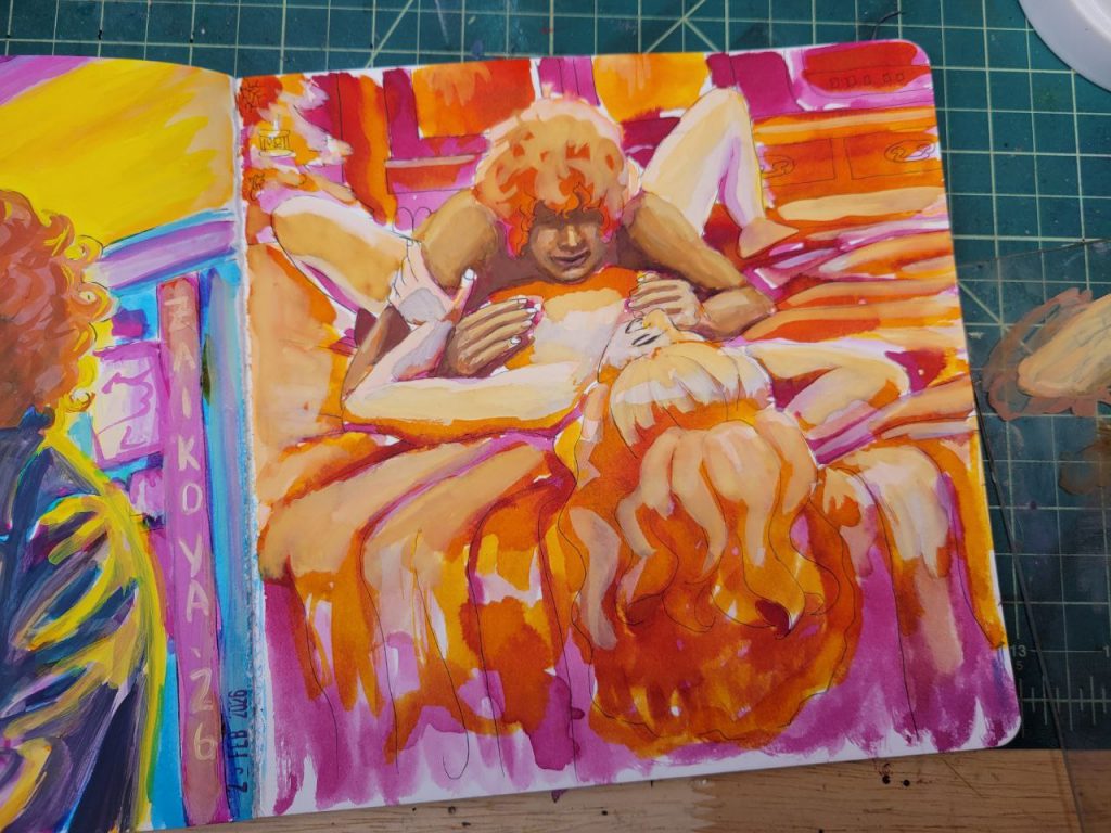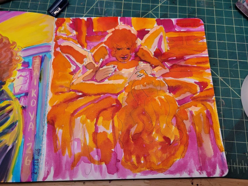 This was with more of the radiant concentrated watercolours, with a red added in, as well as an orange. I could make this one better with a bit more care and love, but I was struggling to get opacity in certain parts and decided to move on. I’ve done about a hundred variations of this drawing/scene, and this is the closest I’ve come to the proper vibes. I hope I can figure this technique out and make this illustration lovely one day.