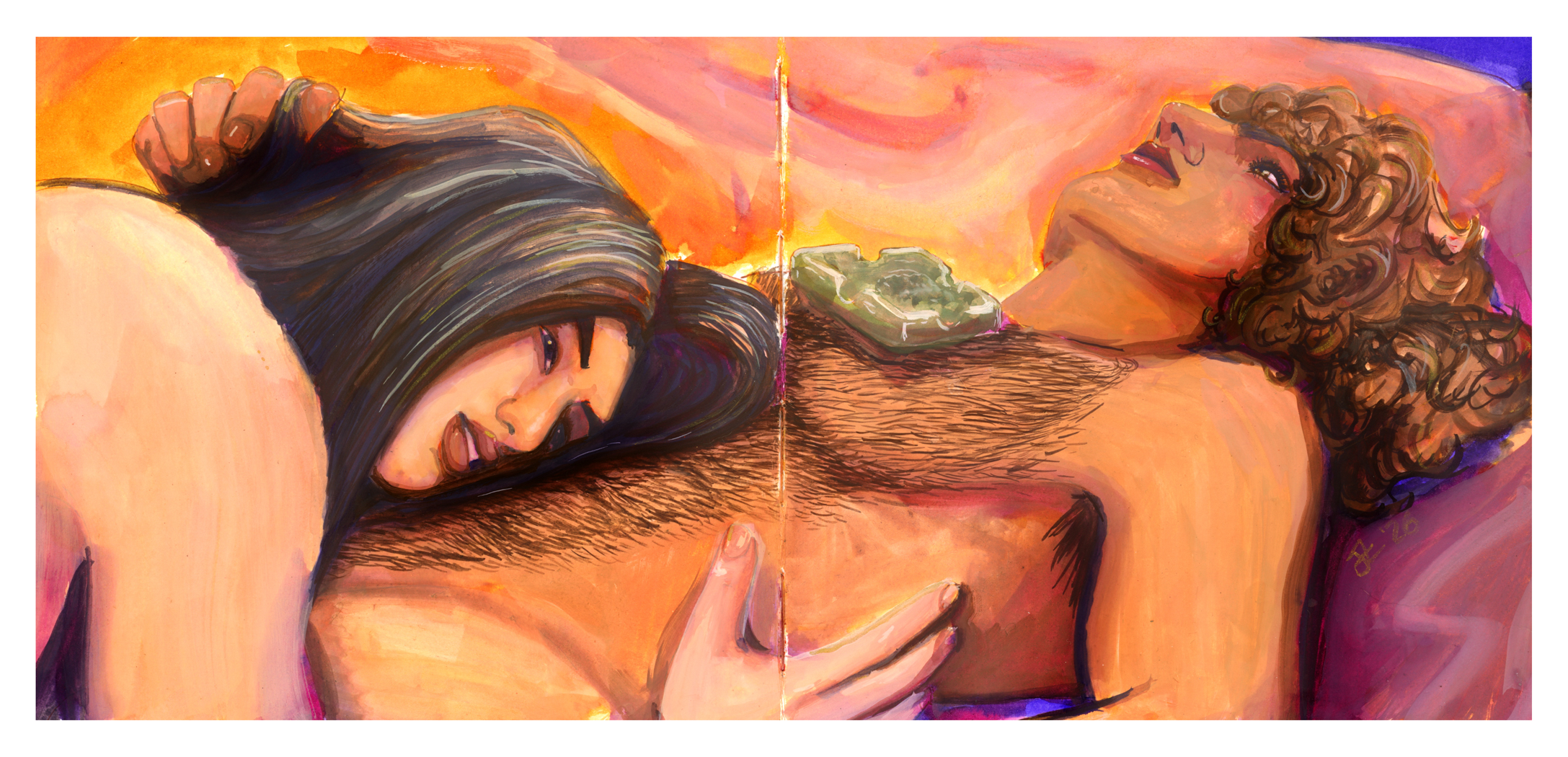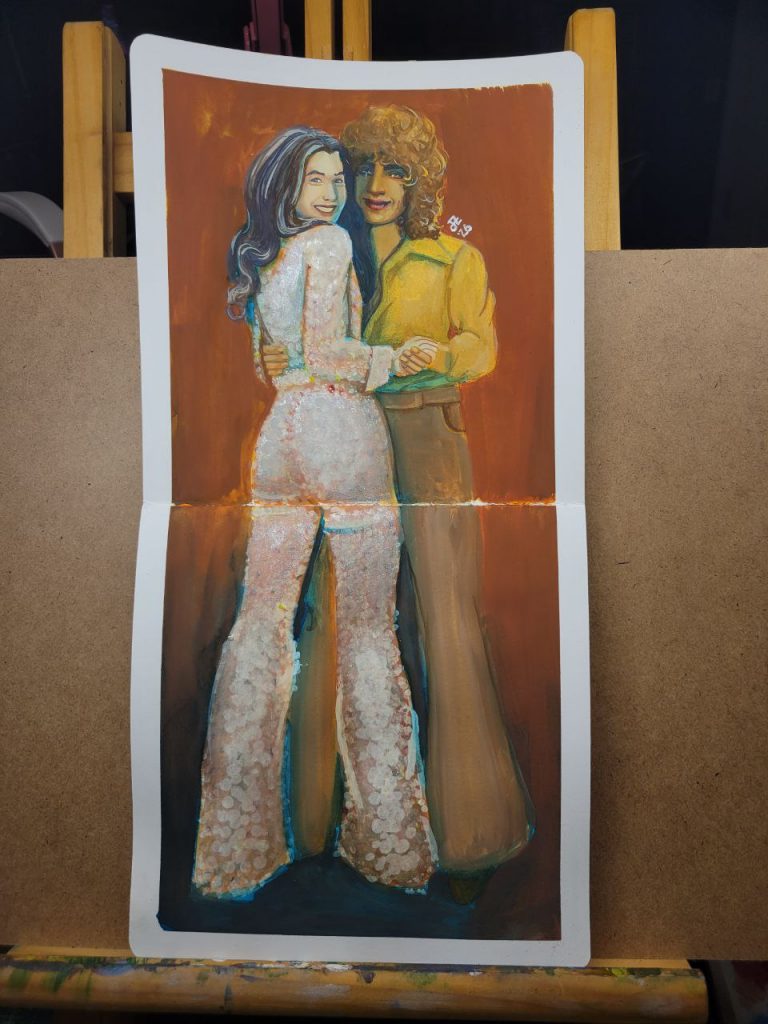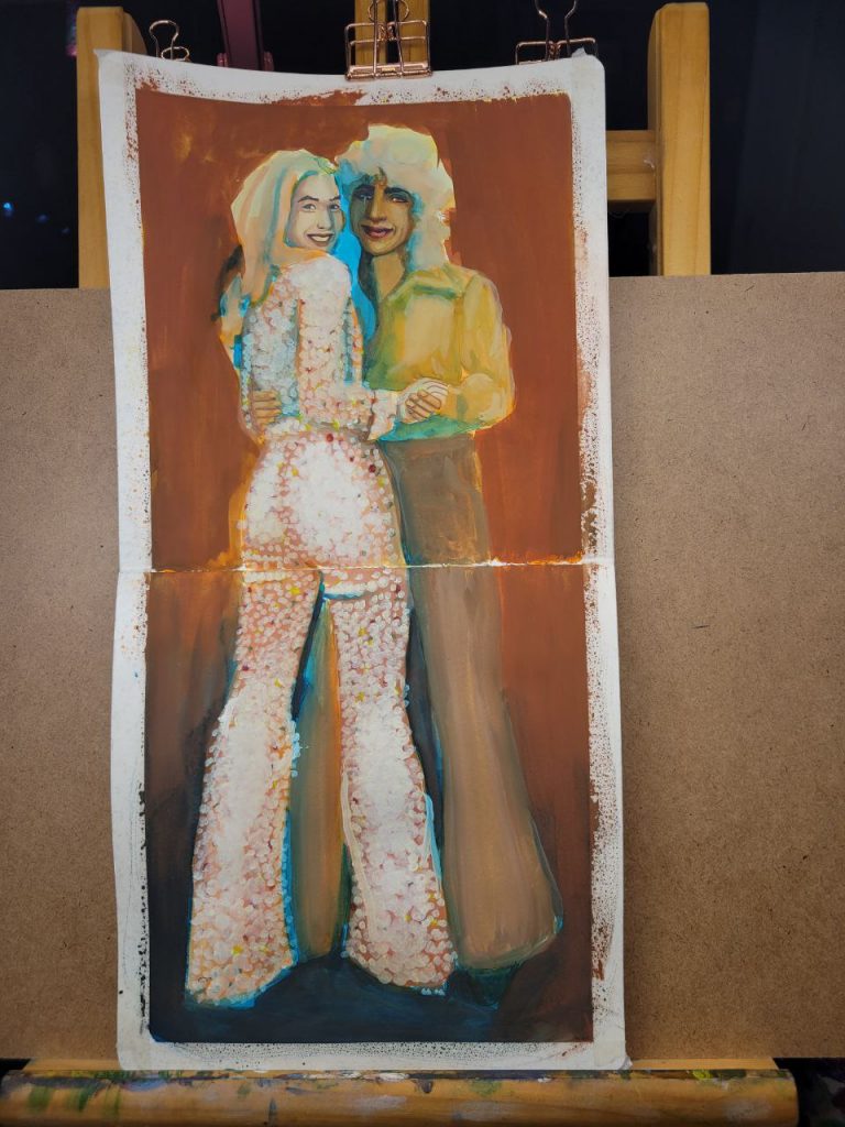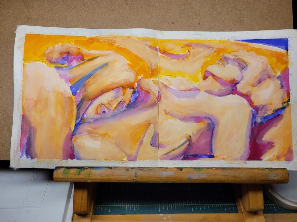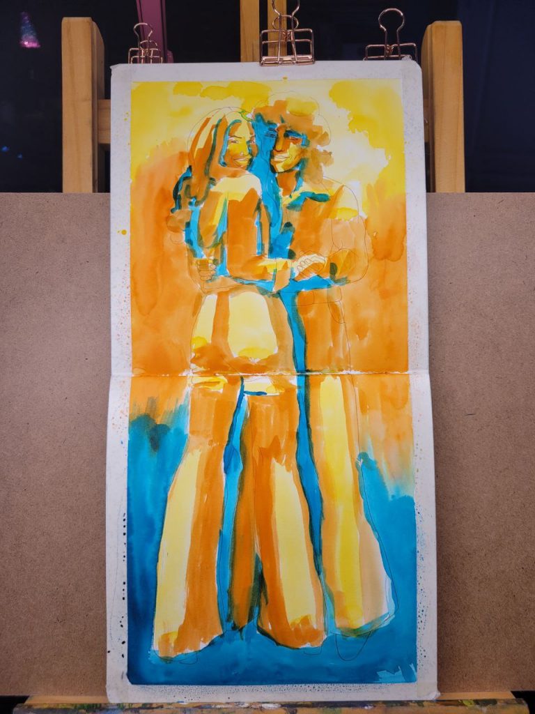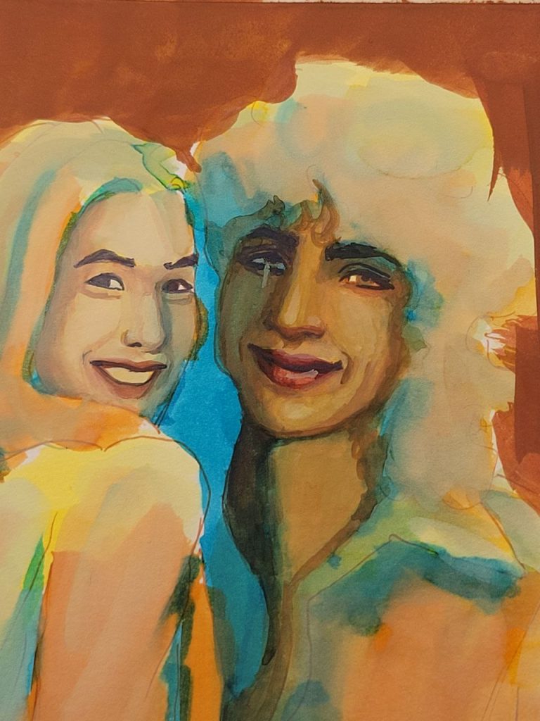 This one was an attempt to use warmer colours in the underpainting. I used Indian Yellow, Burnt Orange, and Juniper Green. I wish I’d used a red instead of a blue for the shadows, and embraced warmth completely. I still really like the way their faces came out, though. I’m proud of myself for allowing shadow to take up an entire half of the face. The blue peeks look great, but they’d be so much better if they were red or brown.
