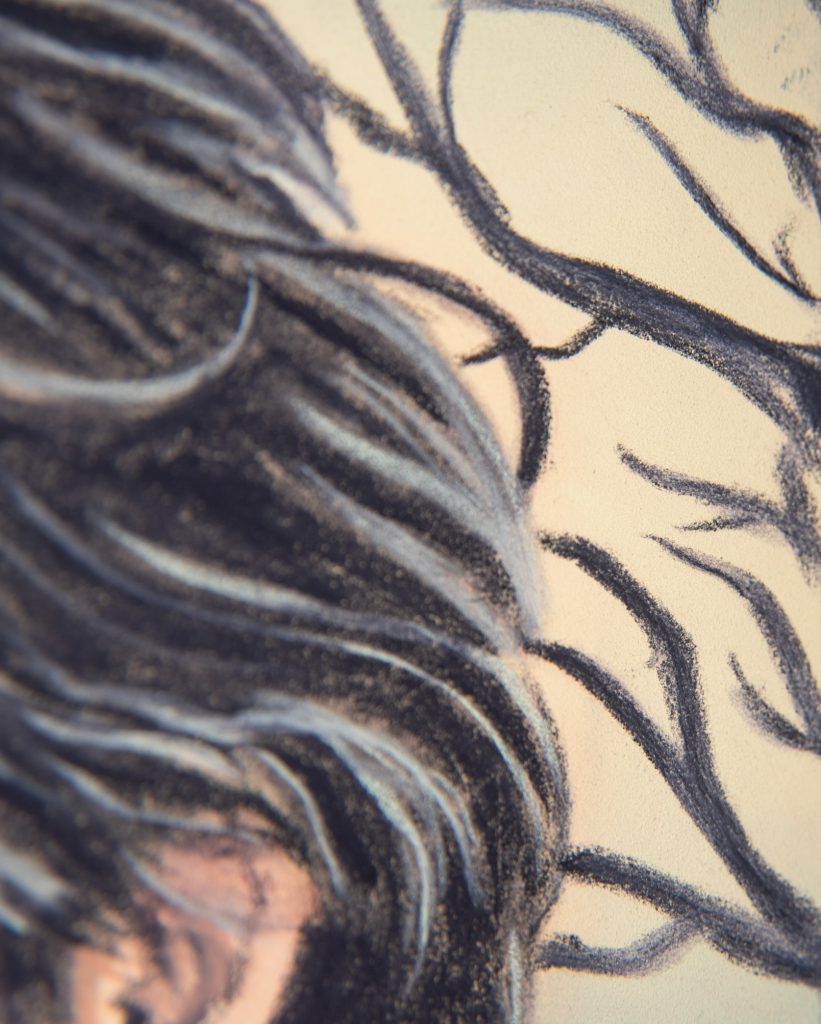 Though I did large laydowns with PanPastel, I used the Sennelier pencils for pretty much everything else. Details and accents, and anything small. I absolutely love these pencils after using them for detail like this. The fact that there is no wood barrel makes them great to use on their side but get thin lines. The branches of the trees are a great example of how beautifully that works. The hair as well. You just skate the pencil along on its shading-edge.
