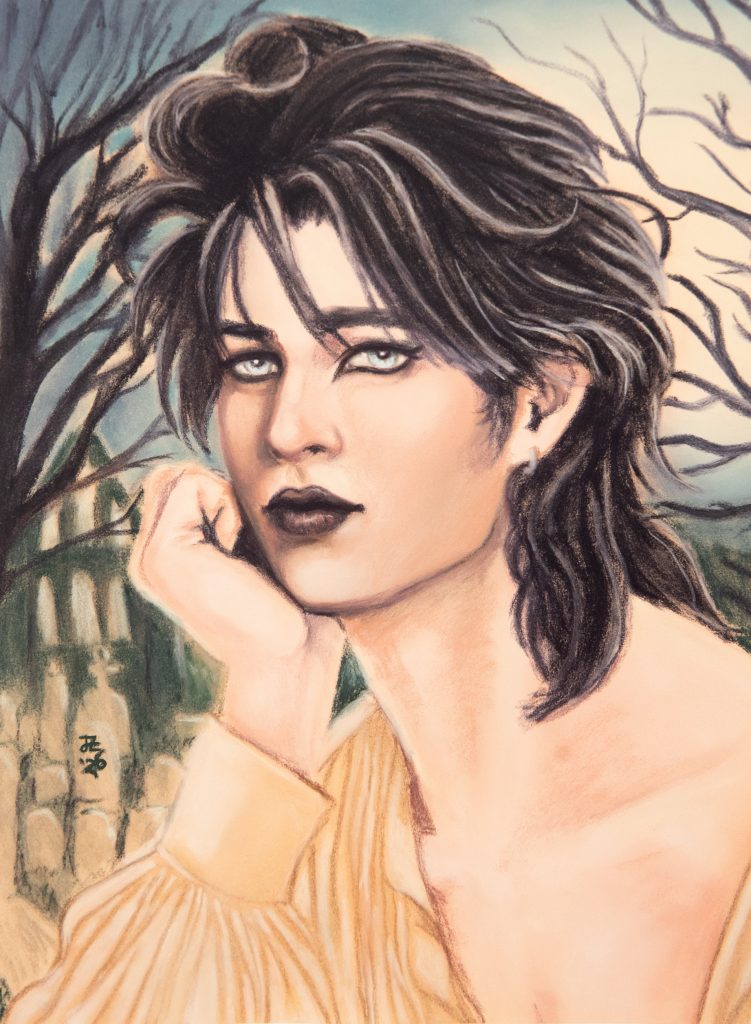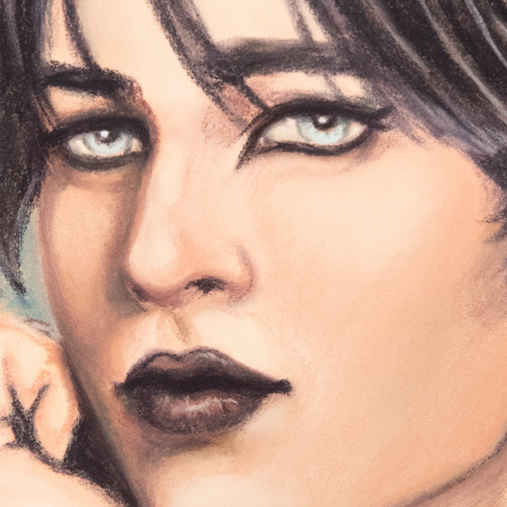 The colour called “Violasceous Grey” (I assume it’s the same as 478 in the soft pastels) makes an amazing black. I didn’t use the Lamp Black at all in this. But, I’m sure there’s some in that colour anyway. But it blends out more purple (more violasceous, if you will), so it fits in nicely with reds. See the shade from eyebrow to nose.